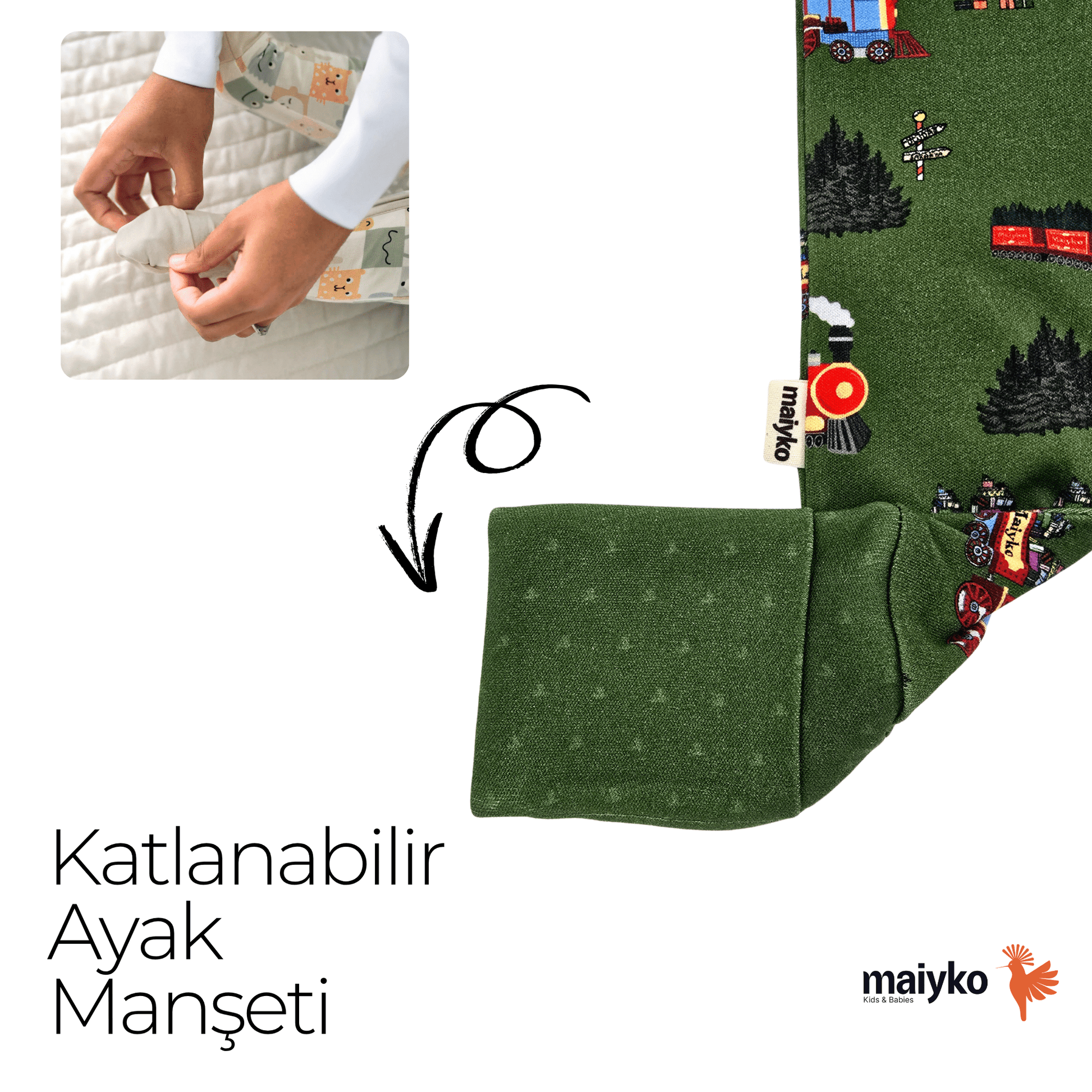 🍃Ormanın içinden geçen masalsı bir tren yolculuğu... Yeşil zemin üzerine canlı renklerle bezenmiş bu desen, doğa sevgisini yansıtıyor.