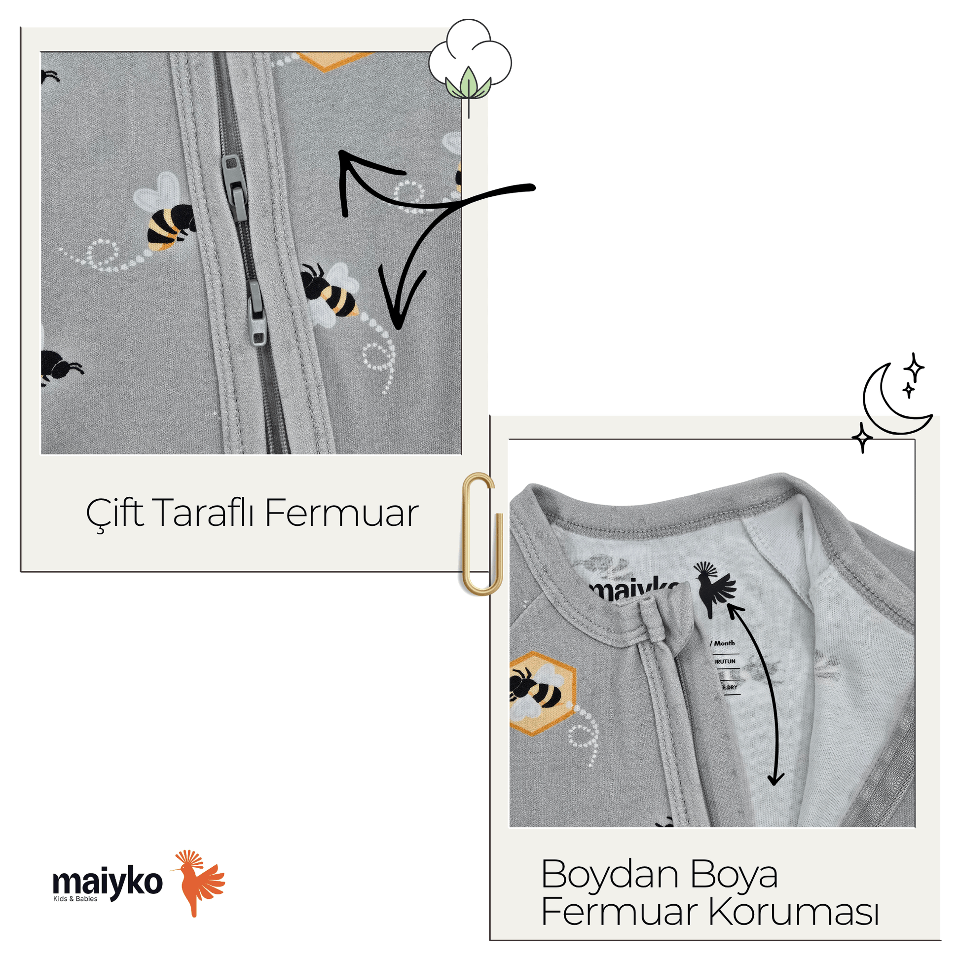 Üstten ve alttan açılan çift elcikli fermuarı sayesinde gece-gündüz bez değişimini kolayca yapabilirsiniz. Tulumu çıkarmanıza gerek kalmaz böylece bebeğinizin vücut ısısı değişmez. Uykusuda bölünmeden sağlıklı bir şekilde tamamlar.