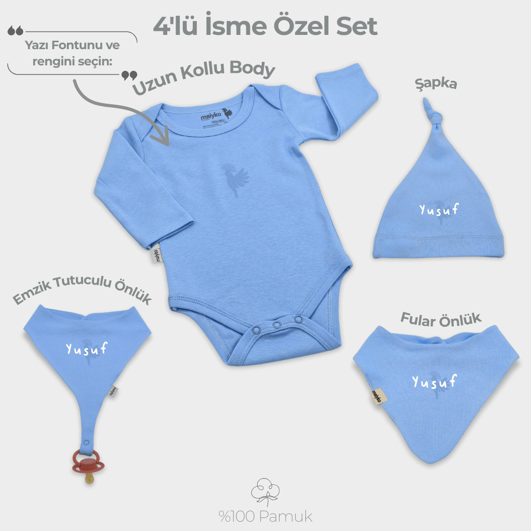 İsme Özel 4'lü Yenidoğan Seti %100 Pamuk Bebe Mavisi